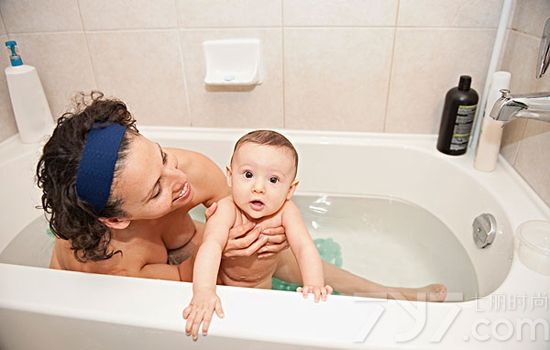 给宝宝洗澡时如果水不小心流入宝宝耳朵里,赶紧将宝宝头部向另一侧倾斜,以免更多的水流进耳朵。