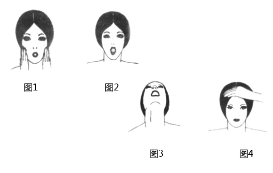 噘起嘴唇,同时吸气到面颊里面,并将每只手的中间3个手指头放在嘴边的面颊上。手指按住鼓起的面颊,但不要把气吐出来。数到10,放松。重复10次。增加到数30.(如图1)
