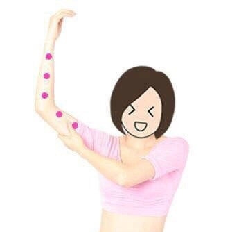 将右手抬起来,手肘弯曲,然后用左手按在右手手臂上,一边呼气,一边按压图中标出的5个小红点,持续按压30秒,然后换另一半按摩。注意力度要控制好,不能太大力。