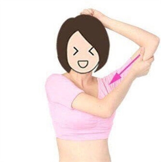 手肘弯曲,左手抬起来放在脑后,然后用右手按压左手肘关节,手掌稍微用力,顺着手肘往下推拿至腋下位置。持续20秒,然后换另一边按摩。