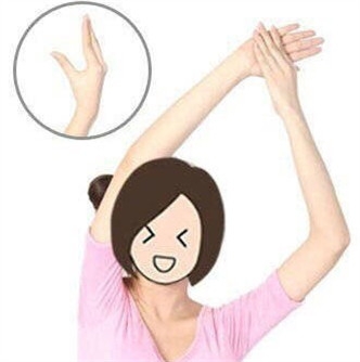 保持均匀的呼吸,然后将右手手臂伸直,抬起至偏左边的位置,再将左手抬起来,左手五指并拢张开,左手手掌放在右手手掌掌心上,推拿小拇指根部,持续推拿15秒,然后换另一边按摩。