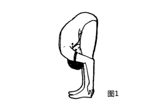 特别提示:在练习时,注意不要以腰部为支点前屈,而要以髋部为支点前屈。同时,动作不要太猛烈,如果无法使额头触及膝盖,也不要勉强形事,但头部要下垂,不得抬起,也不得弯曲膝部。屈体时要把注意力集中在尾骨。