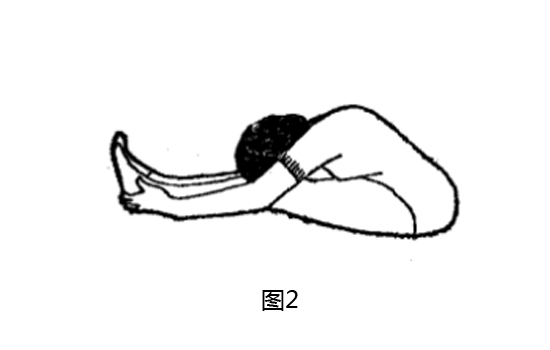 仰卧于练操席上,双臂至于身体两侧,边吸气边坐起来。然后呼气,身体躯干前屈,双臂慢慢向前伸展,双手扳住脚底,肘部下垂到膝盖旁,双腿并拢伸直(如图2)。保持该姿势几秒钟,然后边吸气边坐直。呼气,慢慢滚回到仰卧姿势。这时做一次瑜伽深呼吸,接着重复做上述动作,反复六次。