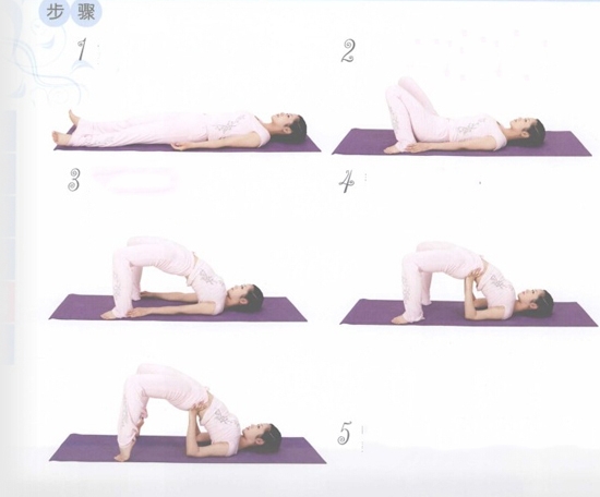 5.呼气,继续讲脚跟抬离地面,脚尖点地,停留数秒。然后慢慢讲臀部、背部放回地面,放松身体,调息。