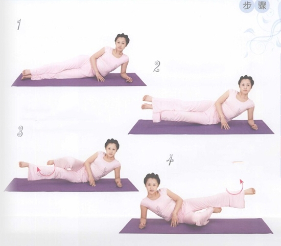 1.侧卧,用左臂支撑着上身,身体压住体侧最外凸的部分;