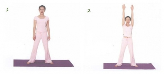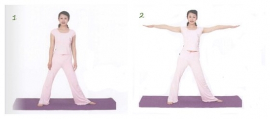 1.站立调息,双脚分开略比肩宽;