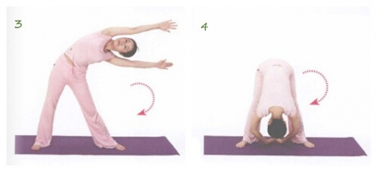 4.顺时针方向垂下下方,双手放在脚内侧,注意体会脚后侧的伸展感和更多的血液倒流回头部的放松感;