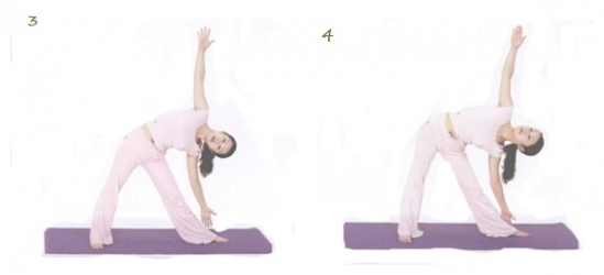 3. 呼气的时候上身向左弯曲,伸展右侧腰,注意放松颈部;