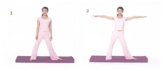 1. 站立,两腿伸直,两脚宽阔分开,扣住右脚掌,打开左脚掌朝侧方向;