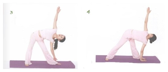 3. 吸气,推髋部向右,上身慢慢向左弯腰,两臂继续成一条直线,尽量垂直于地面;