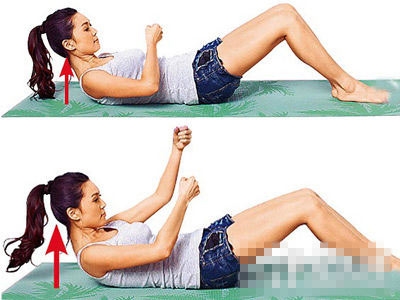 下背贴地 ,用腹部力量抬起上半身,右手不动,左手握拳悬空于右手上,左右手轮流往上抓20下为1回,做4回。