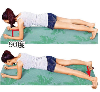 趴姿,前、上臂之间呈90度,两手前臂撑地,双脚张开与肩同宽,以脚尖撑地。