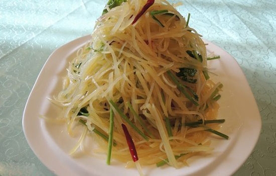做法:将土豆切丝,用白水煮熟后捞起,把土豆丝、盐、味精、香油同方碗中,拌匀即可,用之代替晚餐,如果怕饿,可以搭配白粥。