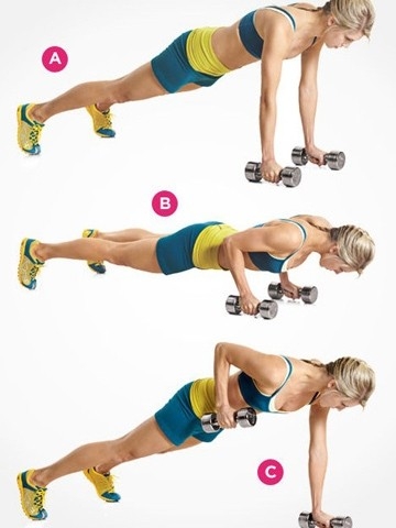 (C)回到原来位置时,右手往后拉哑铃到右胸的位置,保持三秒钟,然后回到初始位置。用左手重复刚刚的动作。