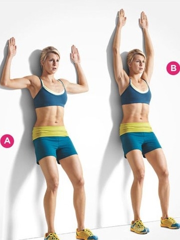 (A)把手和胳膊贴在墙上,手肘弯曲90度保持1秒钟,让你的胳膊肘,手腕和双手都压在墙上,往下滑动你的手肘,收缩肩胛骨,身体往下滑。