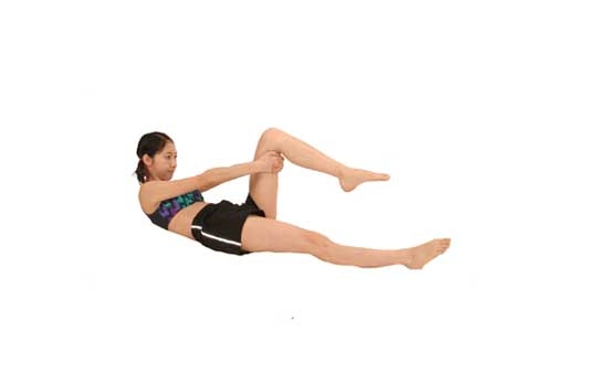 保持仰卧姿势,双手抱紧膝盖,大腿向腹部曲伸,并抬起上半身再轻轻躺下。重复此动作5—10次。