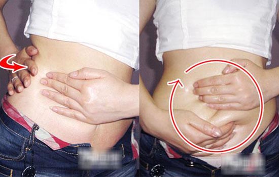 方法:双手伸直,互相交叠摆在肚脐上,大拇指交叉,掌心对准肚脐,男左手在下、女右手在下。稍稍吸气后收小腹,双手顺时针揉36圈,可以帮助肠胃蠕动,摩擦时会感觉到手掌和腹部微热。
