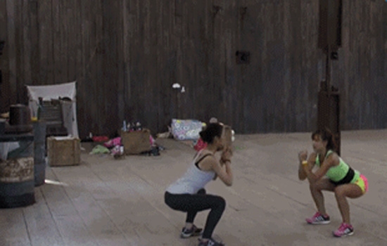 侧移深蹲,即边移动边深蹲。双手交叉举起的同时,马步深蹲,在此期间要注意的是,双手交叉举起,肘关节与地面垂直,双腿张开成A字型深蹲才是标准动作。