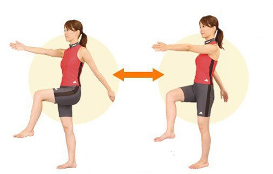 腰挺直,站好,脚后跟贴住地板,用下腹的力提起膝盖。这时大腿内侧与地板平行,保持1秒钟。另一只脚也是一样的方式,重复10~15次。
