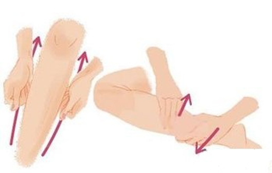 两手一边捏小腿的腿肚子上的肌肉,一边从中间向上下按摩,不断变化按捏的肌肉,梳理经脉,每条腿按摩3~4分钟的样子。按摩方法简要如图。