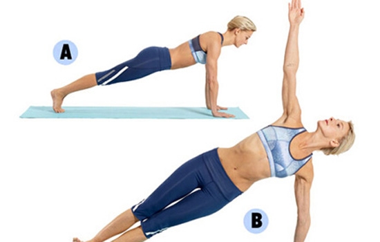 侧板支撑两手撑地,手臂和肩膀成垂直角度,两腿蹬直,背部挺直。左手掌移到垫子中间,左脚支撑,身体自然转向左侧。右脚靠在左脚上,右手臂向上延伸。