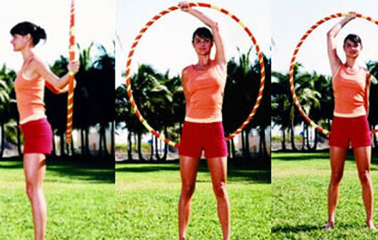 (1)双脚站立,与肩同宽,两臂在身后呈3点和9点位置,握住呼拉圈,使之与身体保持30公分远。吸气挺胸,尽力夹紧肩胛骨.