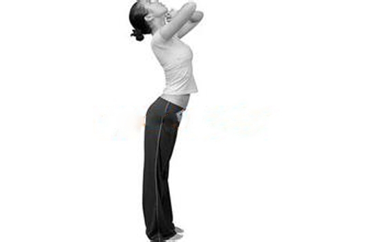 4、做9次呼吸循环,在第10次将手臂放回身体两侧,脊柱挺直,站立休息20秒钟,做10次循环。