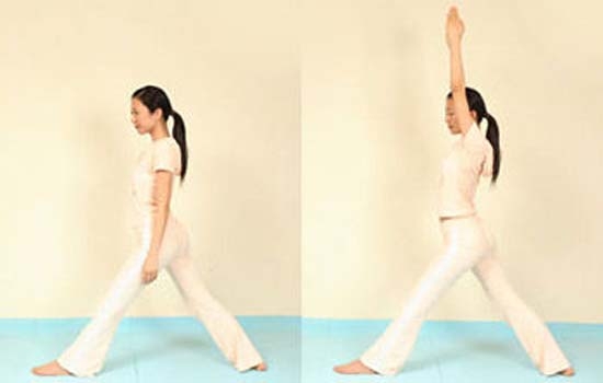 1、尽量向后伸出右腿,同时屈左腿,但左脚要保持原位。