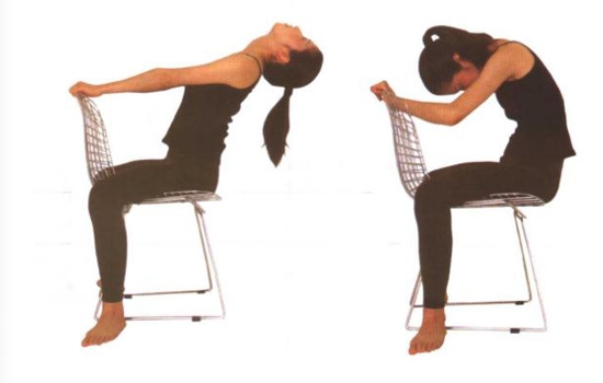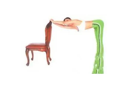 站在椅子背后大约两步的距离,双腿并拢,上身向前俯下,双臂伸直,双手交叠抓着椅背。上身慢慢向左右两侧扭动。