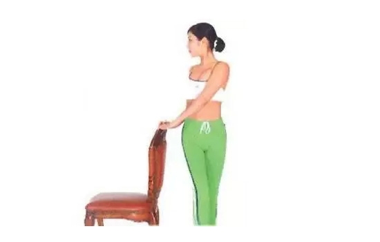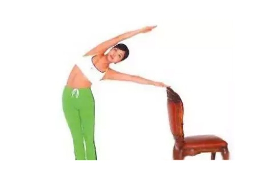 站在椅子的背后,约为两步的距离,左手伸直,扶着背部,上身向左侧倾斜,伸展左侧腰腹,保持这个动作4个呼吸的时间,然后换边重复练习,每边重复5次。