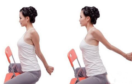 2、先坐在椅子三分之一位置,双手放在椅子上,紧接着吸气,臀部离开椅子,双手使力支撑身体,头向后仰。