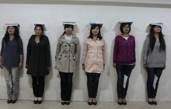 1. 双腿并拢站立,膝盖与脚跟相贴,挺胸收腹,两颊放松,肩胛骨下压,双臂自然垂下,保持3 秒。