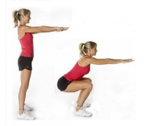 2.屈腿成直角,双臂向前伸直,挺胸收腹,保持翘臀,伸直腰部。