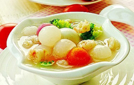 做法:草虾洗净备用,白萝卜、红萝卜分别洗净、去皮、切大块。锅中入水加入白萝卜、红萝卜及柴鱼片一起煮至萝卜熟烂后,再放入炒虾。待水滚后,加入调味料即可。