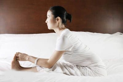 step1 端坐于床上,伸直双腿,双脚并拢,双手抓脚趾。