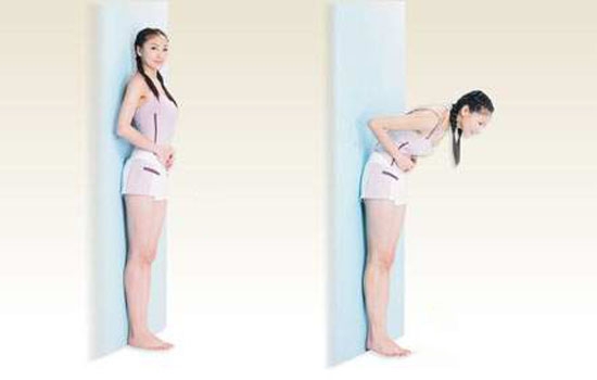 与墙背靠背贴紧,头部、臀部、脚部与墙完全靠紧,尽量不留缝隙,抬头挺胸,目视远方,用脚尖着地,每天坚持五分钟,会有意想不到的收获。