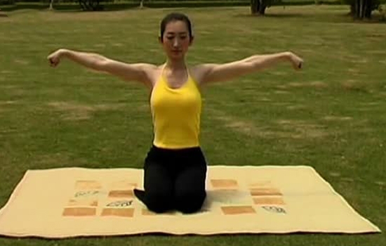 第二步:吸气,同时缓缓抬起双请;呼气,掌心托住后脑勺,打开两肘和胸膛,均匀地呼吸。