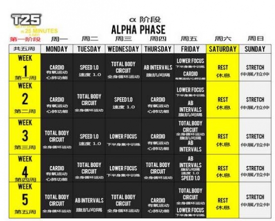 T25有专门的课表,分为三个阶段,一周练5天,休2天,总共18周的课程。
