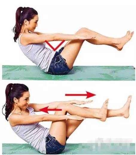 屈膝坐,脚掌不贴地,以臀部撑住全身重量,上半身到膝关节呈V字型,双手平伸。