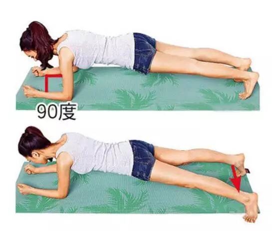 身体趴姿,前、上臂之间呈90度,两手前臂撑地,双脚张开与肩同宽,以脚尖撑地。