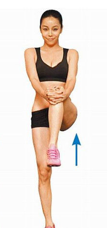 站姿,将一条腿抱住提高,保持上身直立,眼睛平视前方,保持30秒后换边重复动作。