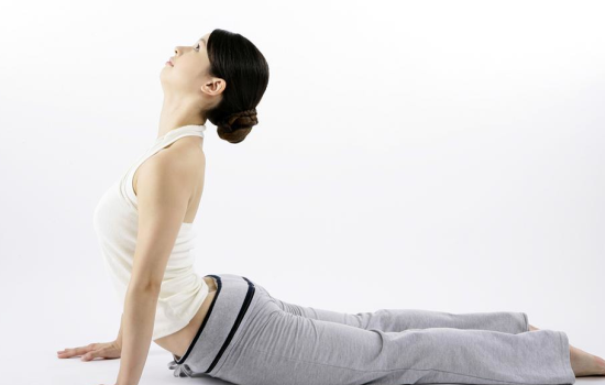 3. 呼气,低下头的同时,腹部往后收缩,此时腰部朝天花板呈拱形拉伸;