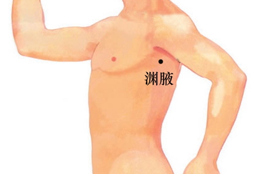 如何取穴:渊腋穴在侧胸部,举臂,当腋中线上,乳头下10厘米,腋下3寸,第4肋间隙中。