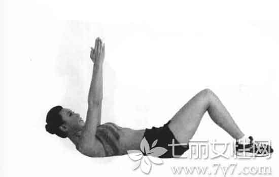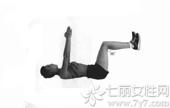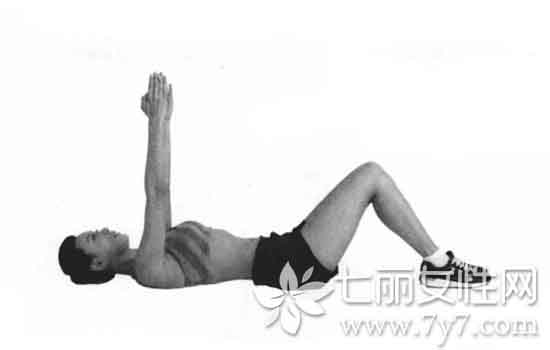 (1)身体平躺,腹部抬起并弯曲呈90度,双臂向上垂直举起。