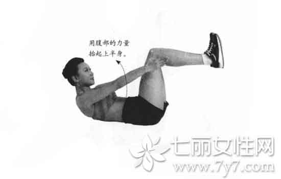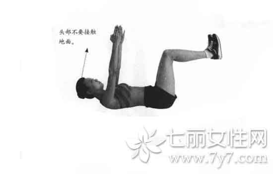 (2)一边呼气一边蜷起上半身,使肩膀离开地面,腹部保持紧张的状态停顿2秒。