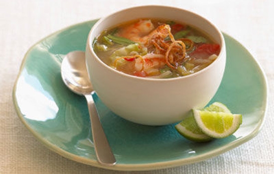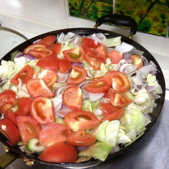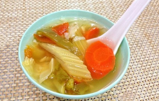 用2到3个大西红柿和1整个高丽菜,加上2个青椒和1小把芹菜及2个洋葱放到大锅子中熬煮到所有的菜变软为止(炖的时候水要浸满菜),在喝前依自己的喜好加盐、胡椒和香菜即可。注意,切忌往汤里放油,盐和胡椒粉也是最后放。