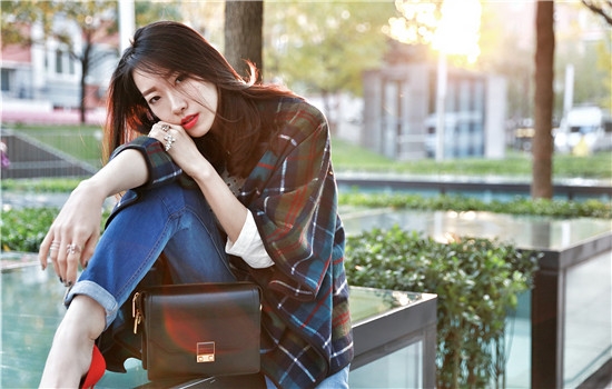 何穗最新街拍,灰色毛衣+墨绿色光泽感半裙,文艺慵懒,少女感十足。马海毛毛衣来自H&M,手提包和粉色毛拖鞋均来自Gucci,半裙来自Tibi 2016