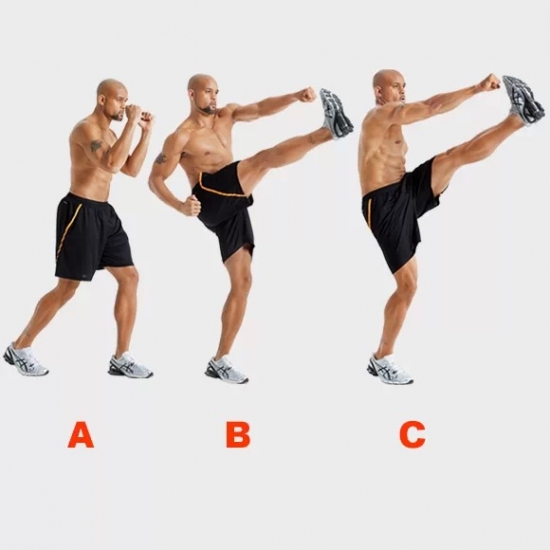 做好战斗式的准备姿势,左腿在前(A),将右腿踢起、左拳向前击出(B),交换双手和双腿,之后将左腿踢出、右手击拳(C),左右交替。