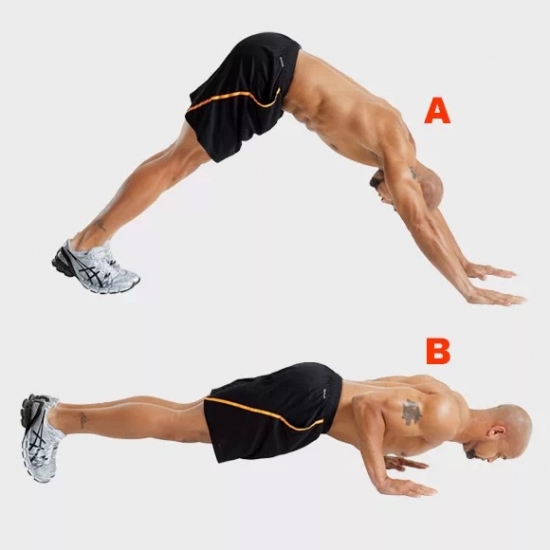从plank的姿势开始,抬起髋部使整个身体呈倒V形(A),放松髋部向下的同时将身体拉向前,弯曲手肘直到胸部几乎接触到地面(B),反转动作回到初始位置,然后重复。