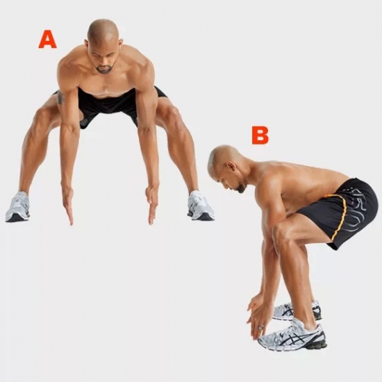 双脚分开大约1.5倍于肩宽,弯曲膝盖、将髋部向后推,将双臂下垂在两腿之间,手指指尖接触地面(A);跳起并且转体90度(B);之后按照顺时针方向旋转跳跃。